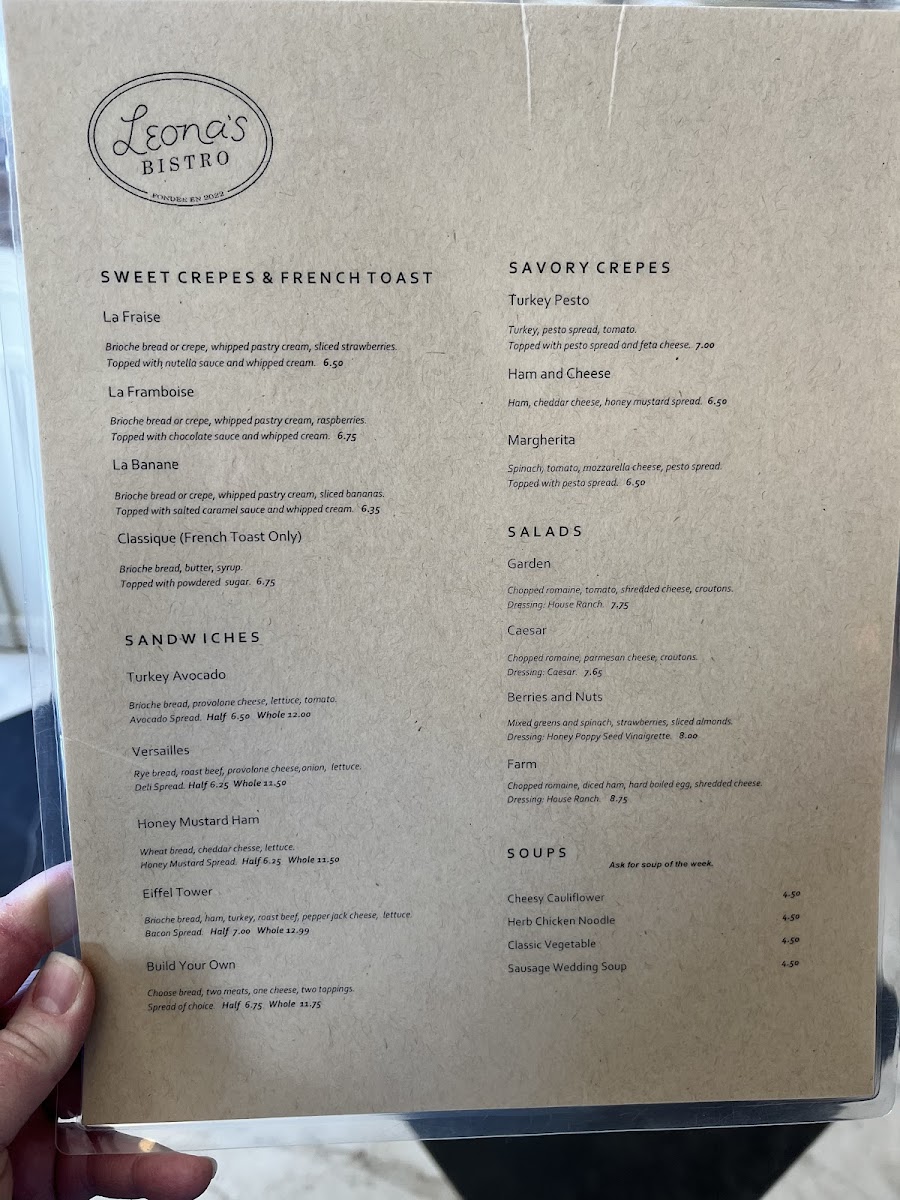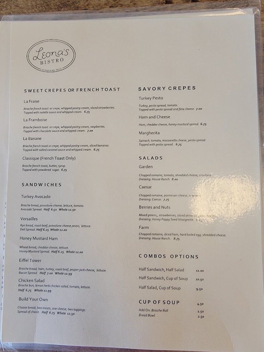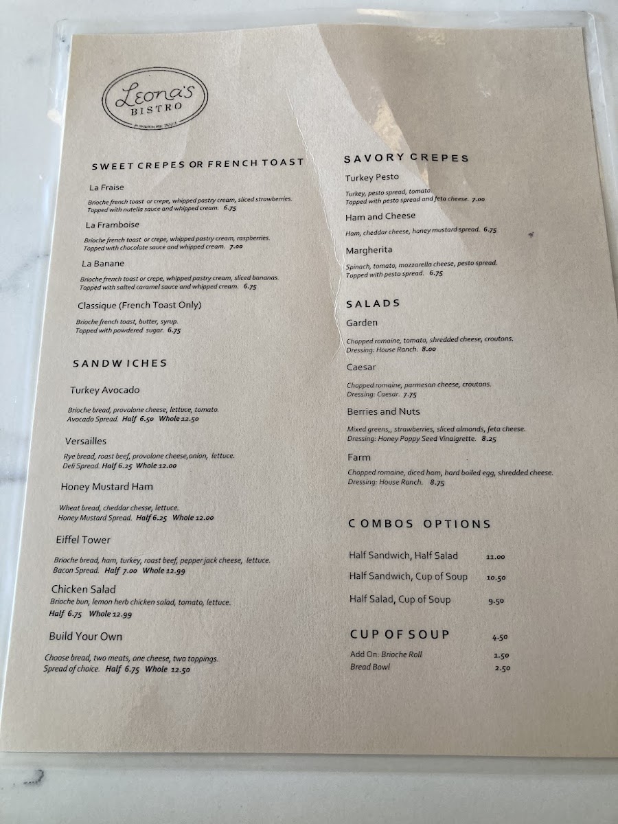 Leona’s Bistro offers a thoughtfully curated menu that blends simple café fare with comforting, flavorful bites perfect for any time of day. Whether you’re stopping by for a relaxed breakfast or a light lunch, the menu’s range invites you to linger and savor each moment. Sweet crepes like La Framboise and La Banane provide gentle mornings while savory options such as the turkey pesto or ham and cheese crepes fit well with a midday pause.